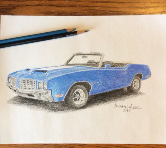 1972 old blue convertible car drawing, note card or print, muscle car