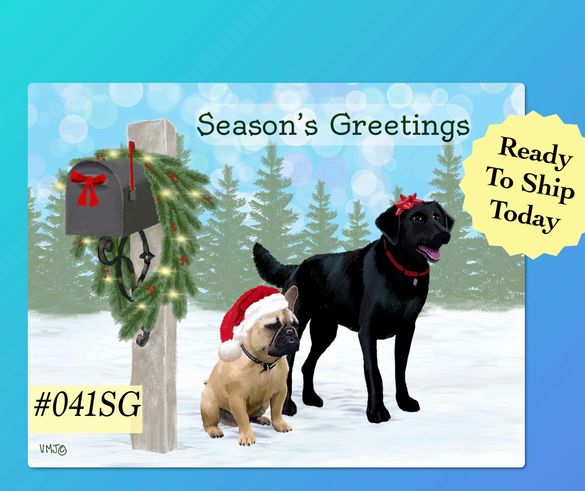 #041SG French Bulldog and Black Lab Season’s Greetings Postcards, Holiday postal postcards Letter Carrier, Mail Carrier