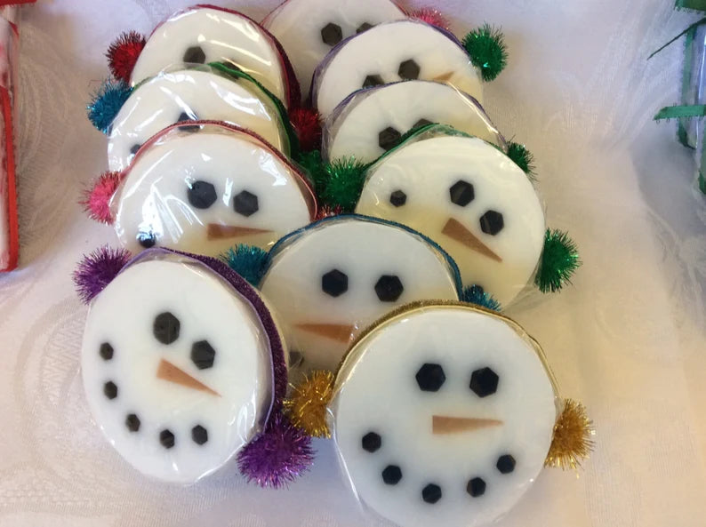 These soaps are made in a loaf, therefore they remain a snowman throughout the life of each soap. Also, the carrot noses are sometimes bigger or smaller, depending on how the loaf looked when it was finished.